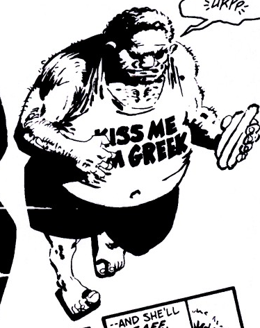 Agamemnon, is a friend to Dwight, who gives him photography jobs related to private investigation and lets him use his darkroom but keeps the half cash. Gets Dwight out of jams in exchange for food. Often seen wearing a 'Kiss Me, I'm Greek' shirt. Most of his sentences end with, "I tell ya, I could write a book..."